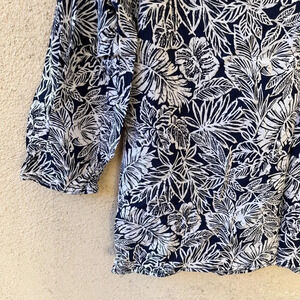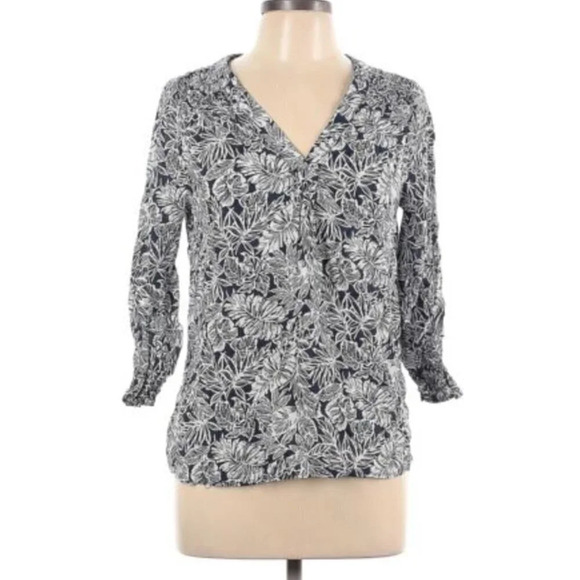 V-neckline. 3/4 quarter length sleeves. Tropical floral print. Ruched detail at sleeve hems. light weight material 100% rayon.