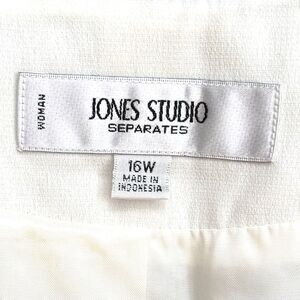 This Jones New York Women's Creamy-White Blazer is available for purchase in size 16W. The blazer is a classic and timeless piece perfect for the office as well as social occasions. This blazer features long sleeves, an open front, a lined interior, and shoulder pads for a sophisticated look. Made from a blend of polyester and spandex, this blazer is comfortable and easy to care for with its dry clean only requirement.