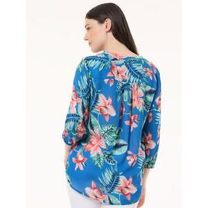Jones New York Women's Blue Lagoon Multi Printed Chiffon Tunic Top Size XS NWOT. Step into paradise with our stunning pleat tuck tunic, adorned in a captivating tropical print. Designed with delicate pleats and elastic cuffs, this tunic effortlessly blends style with comfort. Perfect for beachside strolls or casual outings, it's a must-have piece for your summer wardrobe. Women's Top Length is 28 1/2". V-Neckline; 3/4 Sleeve Length; Pullover. 100% Polyester. Machine Wash Cold on Gentle Cycle. top, women, floral, peasant, multi, printed, blue, chiffon, tunic, casual, travel party, clubwear, disco, comfy, comfort. October 252.