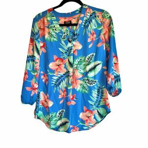 Jones New York Women's Blue Lagoon Multi Printed Chiffon Tunic Top Size XS NWOT. Step into paradise with our stunning pleat tuck tunic, adorned in a captivating tropical print. Designed with delicate pleats and elastic cuffs, this tunic effortlessly blends style with comfort. Perfect for beachside strolls or casual outings, it's a must-have piece for your summer wardrobe. Women's Top Length is 28 1/2". V-Neckline; 3/4 Sleeve Length; Pullover. 100% Polyester. Machine Wash Cold on Gentle Cycle.