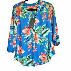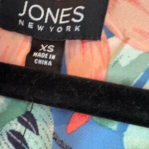 Jones New York Women's Blue Lagoon Multi Printed Chiffon Tunic Top Size XS NWOT. Step into paradise with our stunning pleat tuck tunic, adorned in a captivating tropical print. Designed with delicate pleats and elastic cuffs, this tunic effortlessly blends style with comfort. Perfect for beachside strolls or casual outings, it's a must-have piece for your summer wardrobe. Women's Top Length is 28 1/2". V-Neckline; 3/4 Sleeve Length; Pullover. 100% Polyester. Machine Wash Cold on Gentle Cycle.