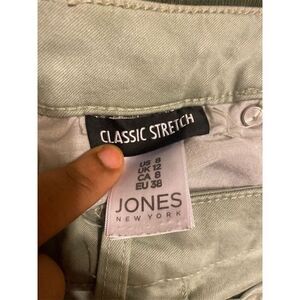 Keywords: Jones New York, Capri pants, green pants, women's pants, casual wear, classic fit, stretch material, pull-on pants, back pockets, solid color, size 8, regular size, women's fashion, pre-owned clothing.