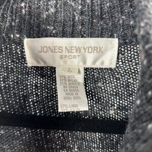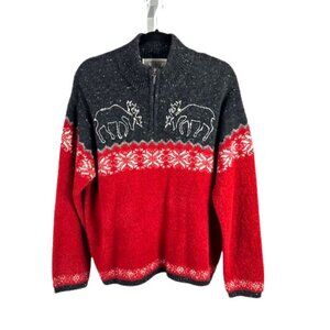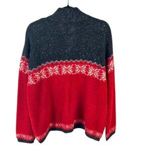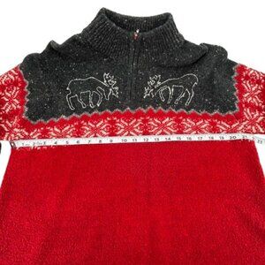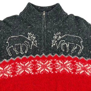 This is a stylish Jones New York Sport sweater, size L, featuring a festive design perfect for the holiday season. The sweater boasts a rich red body with a contrasting dark gray upper section. It showcases a charming pattern of reindeer with snowflakes, embroidered in white, adding a cozy and seasonal touch. The fabric composition includes 57% wool, 22% nylon, 21% acrylic,, offering a warm and comfortable feel. Made in Hong Kong, this sweater is in excellent condition, ideal for resale as a high-quality, branded winter garment. The quarter-zip neckline adds a practical and trendy detail.