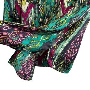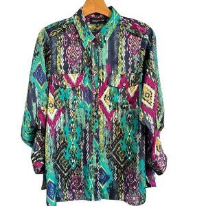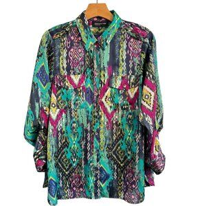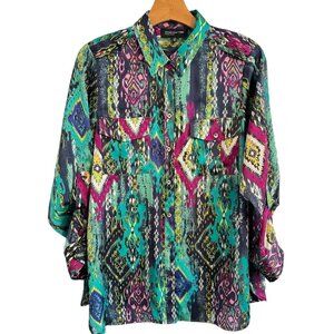 Jones New York Women's Shirt Size Large Green Paisley Hidden Button Up Tie Waist