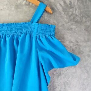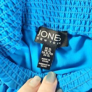Jones New York women’s tunic top in size XL, featuring a vibrant blue color with eyelet cutout details and an off-shoulder neckline with straps. Flowing asymmetric hem adds a breezy, boho touch—perfect for summer, vacation, or resortwear.