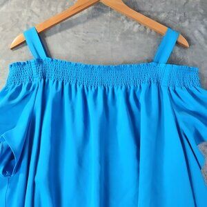 THEME/STYLE: Jones New York, off shoulder, eyelet hem, boho, summer top, blue blouse, XL, festival, flowy, scalloped hem, cottagecore, beachwear, resort, vacation, peasant top, romantic, eyelet top, boho chic, vacation wear, beach coverup, summer blouse, XL top, resortwear, airy top, casual chic, festival style