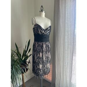Elegant and sultry Jones New York cocktail dress featuring a soft blush-toned lining under black lace with subtle sequin accents. Draped sweetheart-style neckline and wide satin waistband create a flattering hourglass shape. Perfect for cocktail parties, weddings, or evening events.