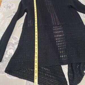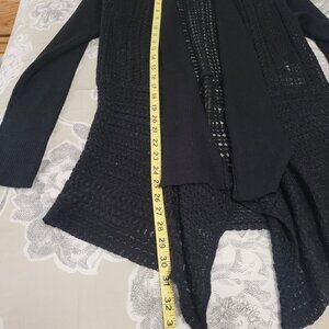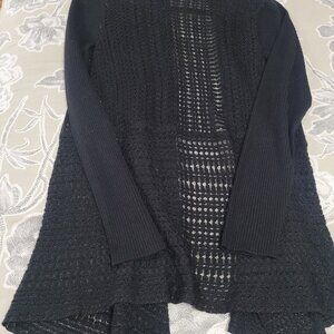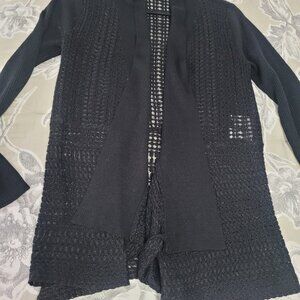 Jones New York Wool Blend Dressy Black Open Cardigan. Metallic threads add a glimmer. Open weave, with knit in waist detail for a flattering fit. Soft open wrap front. The light weight wool blend makes it great for a little added warmth in all seasons. Size Small. Measurements in photos. Excellent condition.