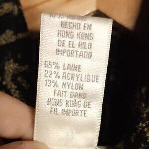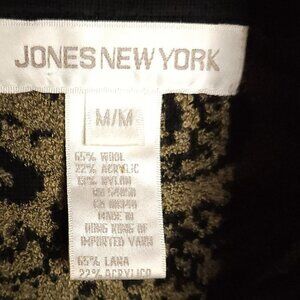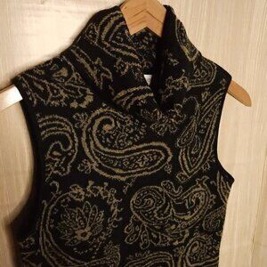 Jones New York women’s wool blend sleeveless cowl neck black tan sweater medium. Gently used condition. Measurements are: 24” from shoulder to hem, and 19” from armpit to armpit.