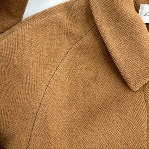 Jones New York coat, wool blend coat, tan pea coat, long coat, classic coat, structured coat, winter coat, fall coat, workwear coat, professional coat, elegant coat, timeless style, warm coat, neutral coat, brown coat, full-length coat, business casual coat, career fashion, vintage-inspired coat, sophisticated coat, layering coat, button-up coat, lined coat, outerwear, cold weather coat, luxury coat, formal coat, dress coat, overcoat, trench-style coat, tailored fit, stylish winter coat