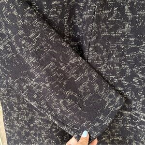 Elegant and versatile Jones New York wool blend coat featuring a cropped sleeve design and single button closure. This mid-weight jacket has a subtle black metallic textured pattern, perfect for adding sophistication to both casual and dressy looks. Classic collar and tailored fit make it a timeless wardrobe staple. Ideal for fall, winter, and early spring wear.