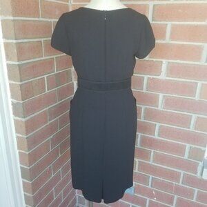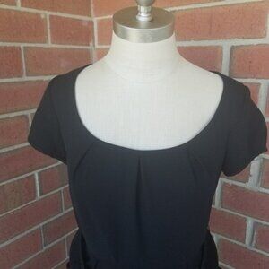 Short sleeved black dress with belt and pleated round neck, side pockets and back zipper.