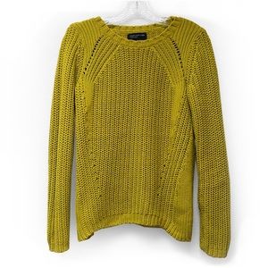 Mustard yellow open knit sweater by Jones New York. Scoop neck, slim fit, long sleeve. Perfect for a muted pop of color.