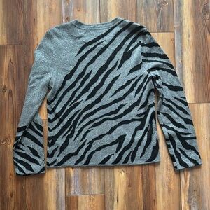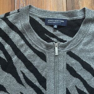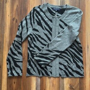 This zip up cardigan is just the right amounts of metallic sparkle with the black zebra or animal print that makes it both fun and classy for the winter season or for a special holiday moment. Excellent preowned condition and in Petite medium