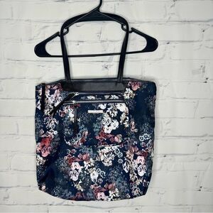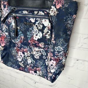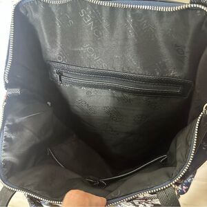 Great condition and love it. The bag is on the back and it seems attached and not removable. The whole bag measures 17x16.