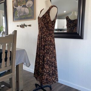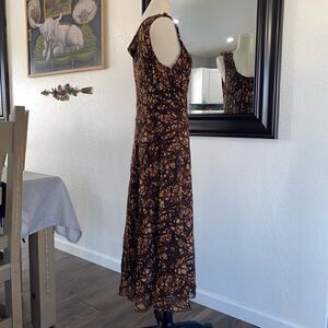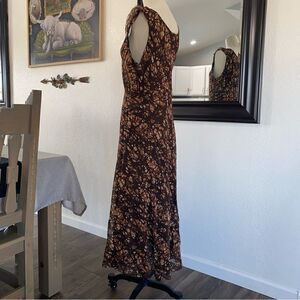 This maxi dress is perfect for any occasion! It features a beautiful butterfly print on a brown silk fabric. The dress is size 16 and features a scoop neckline and sleeveless design. The high-low hemline gives it a unique and modern look. It will look great paired with sandals or heels, and is sure to be a favorite in your wardrobe!