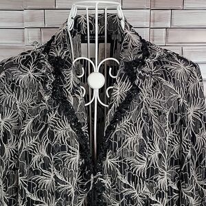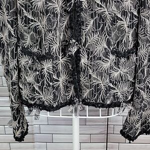 A nylon silk combination sheer netting with embroidery accents blazer by Jones New York. A notched collar with embroidery trim and fabric bow detailing, hook and eye front closure and two patch pockets. Lovely jacket and in great pre-owned condition.