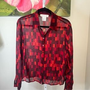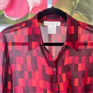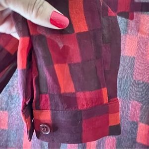 Gorgeous Jones Of New York Red Black, Orange Checkered Plaid 100% Silk Button Down Blouse . Top is Sheer, soft silk and comfortable