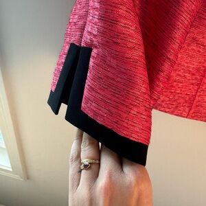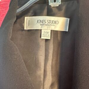 This Jones Studio blazer combines a vibrant pink color with striking black trim, creating a sophisticated look. The textured fabric and tailored silhouette make it ideal for formal occasions. Its notched lapel adds a touch of elegance to this standout piece.