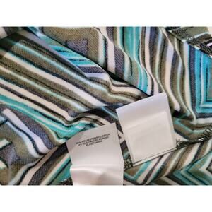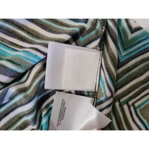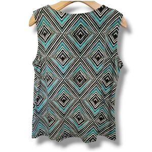 Stylish and versatile sleeveless blouse by Jones Studio Separates. Features a bold geometric print in teal, black, and white tones, perfect for career wear or casual chic looks. Polyester elastane blend offers comfort with a touch of stretch. Size large, gently used and in excellent condition. Ideal for office, layering, or weekend wear.