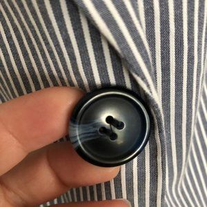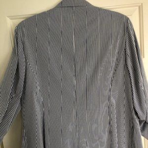 This size 14W nautical-inspired striped jacket is the perfect accompaniment to your spring/summer wardrobe! With a singular button, faux pockets, and rouched sleeves, it has style for days! Denim blue stripes against crisp white give it a seersucker look. It is roomy without being boxy. Throw this over your favorite white button down, add a jaunty scarf and you're off!