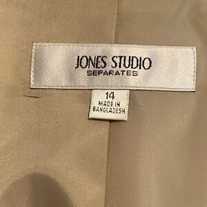 Elevate your professional wardrobe with this Jones Studio blazer in a versatile light beige shade. Perfect for office wear, business meetings, or layering over a dress for a polished look. Features a classic two-button closure, front flap pockets, and a fully lined interior for a structured fit. Size 14, made in Bangladesh.