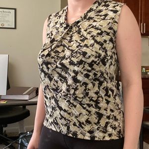 Black, white, grey, tan patterned work blouse. 95% polyester 5% Elastane. Alittle stretch.