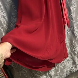 Chic burgundy dress with a V-neck and satin bow. High low hem adds flair. Ideal for elegant events. Excellent used condition. Absolutely stunning.