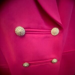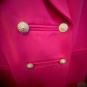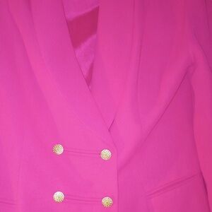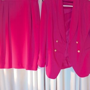 Professional Chic Barbie-core Pink 2 piece double breasted blazer accented with gold buttons, A-line skirt with front pleats and back slit. Gorgeous wardrobe addition for professional or dress occasions.
