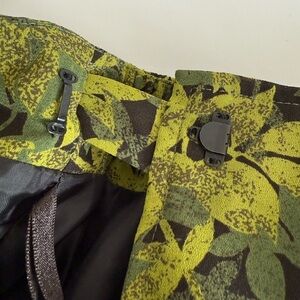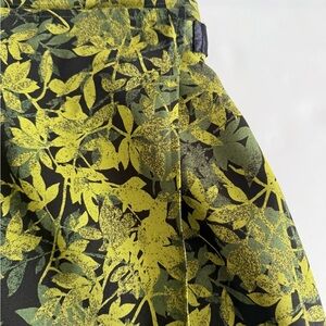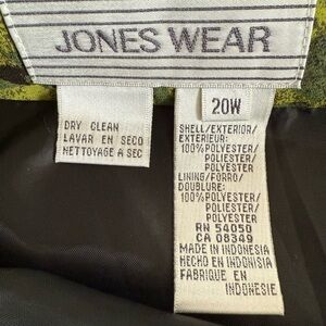 Embrace the elegance of the Jones Wear Sarong, featuring a lush green and black foliage-inspired design. This lightweight and flowing wrap is perfect for adding a touch of nature to your workwear attire. Secure it effortlessly with its stylish tie, ensuring both comfort and style. Modified tie. Added artistic flare with three ties verses traditional two. Elastic at sides for additional room as needed. Hook and eye at each front waist ends. Securely keeps wrap in place. Fully lined with black contrasting fabric. Two back darts at waist. Two front darts and an additional front dart on wrap. Hidden hem. No pockets. Size 20W. 100% polyester shell and lining.