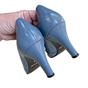 Jones Wear "Candyapple" Open Toe High Heel Pumps - these are a wonderful shade of blue best described as powder blue with a hint of gray. Classic wingtip punched details add interest to the basic look - these are a fine basic to add to your classic career footwear. In ladies US size 9M - leather uppers - fine looking shoes with traditional vibes. In excellent pre-owned condition - these could be mistaken for brand new!