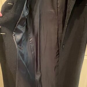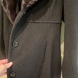 Like new. Worn once. perfect condition. Long formal trench coat with faux fur collar, pockets.