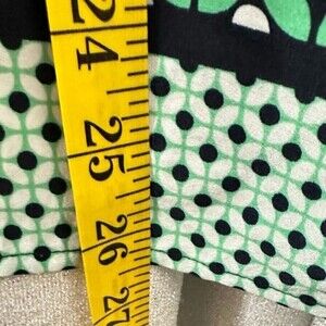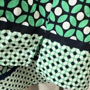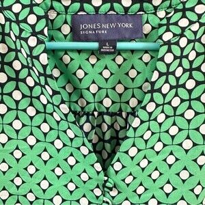 Jones of New York Sleeveless Geometric Pattern Top Size Large in navy, green & white. Features slight v neck with front buttons & side slits near the hem line. Great lightweight top to pair with jeans for casual look or blazer & slacks for modern casual business look.