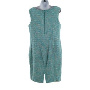 This brand-new Jones New York sleeveless tweed dress is a sophisticated piece, featuring a turquoise, cream, and white pattern with subtle metallic shimmer accents. Fully lined in cream, the dress offers a tailored look with a hidden back turquoise zipper and hook-and-eye closure. Made with a blend of cotton, polyester, and other fibers, it’s both stylish and comfortable.