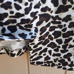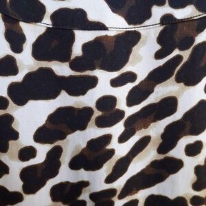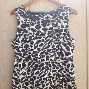 Rich cream, brown and black Leopard print scoop neck sleeveless sheath dress with back zipper entry and slit by Jones New York Signature.