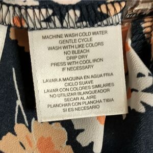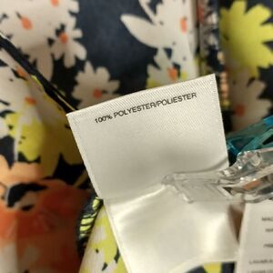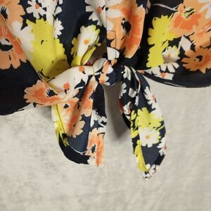 Jones New York Blouse with Tie in Front. Size Medium with flutter type sleeves. Print is white, yellow and orange on a navy blue background. Polyester fabric. No rips, tears or discolorations. Smoke free/Dog friendly home.