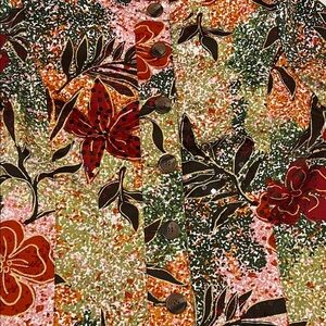 Fully lined with polyester, it features button-front closure, 3/4 sleeves, and a bold botanical print in reds, greens, pinks, and earth tones.