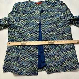 Add a pop of color to your wardrobe with this vibrant chevron-patterned jacket by Joni B. Perfect for layering, this lightweight blazer features: