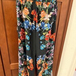 Designer pretty floral pant with front tie and elastic waist. Very elegant yet comfortable with wide (straight) leg pant. Throw on a blazer and heels to dress the pants up or wear out with sandals and a t-shirt to give a casual look! You can't go wrong with these cute pants!