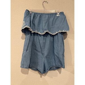 Stylish and versatile Jopana women’s denim romper in a classic blue wash. Size Medium. This casual one-piece features a flattering fit with short sleeves and button-up front, perfect for warm weather, weekend outings, or casual days.