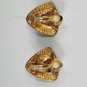 Discount shipping on this item. Jordache 1980s Deco antique gold edged blue, light green & aqua enamel in triangles on a triangle shaped earring. These are clip on style, new old stock, still on their original card. Jordache started as a blue jean company and then branched out, these were made to go with their jeans. Classic traditional style perfect for work or a dress up occasion. Comes in a new jewelry box, great for storage or for gifting. Box size varies.