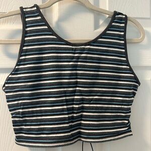 This stylish tank top from Jordache features a chic ruched design with alternating blue and white stripes. The cropped style and scoop neckline make it perfect for casual outings or lounging. Crafted from stretchy, comfortable fabric, it offers both fashion and ease of wear.