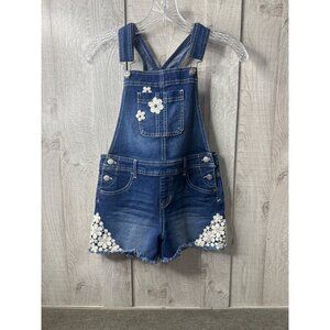 Jordache Girls Denim Overall Shorts L 10-12 Blue With Floral Embroidery