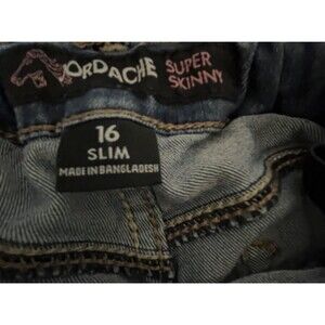 This a pair of Jordache super skinny blue denim jeans in a girls' size 16 Slim. The are in good used condition.