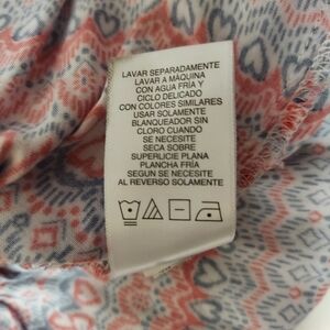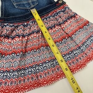Adorable jumper dress. Blue denim overalls with a colorful red, white, and blue ikat-style patterned skirt. Girls 3T, measurements pictured.