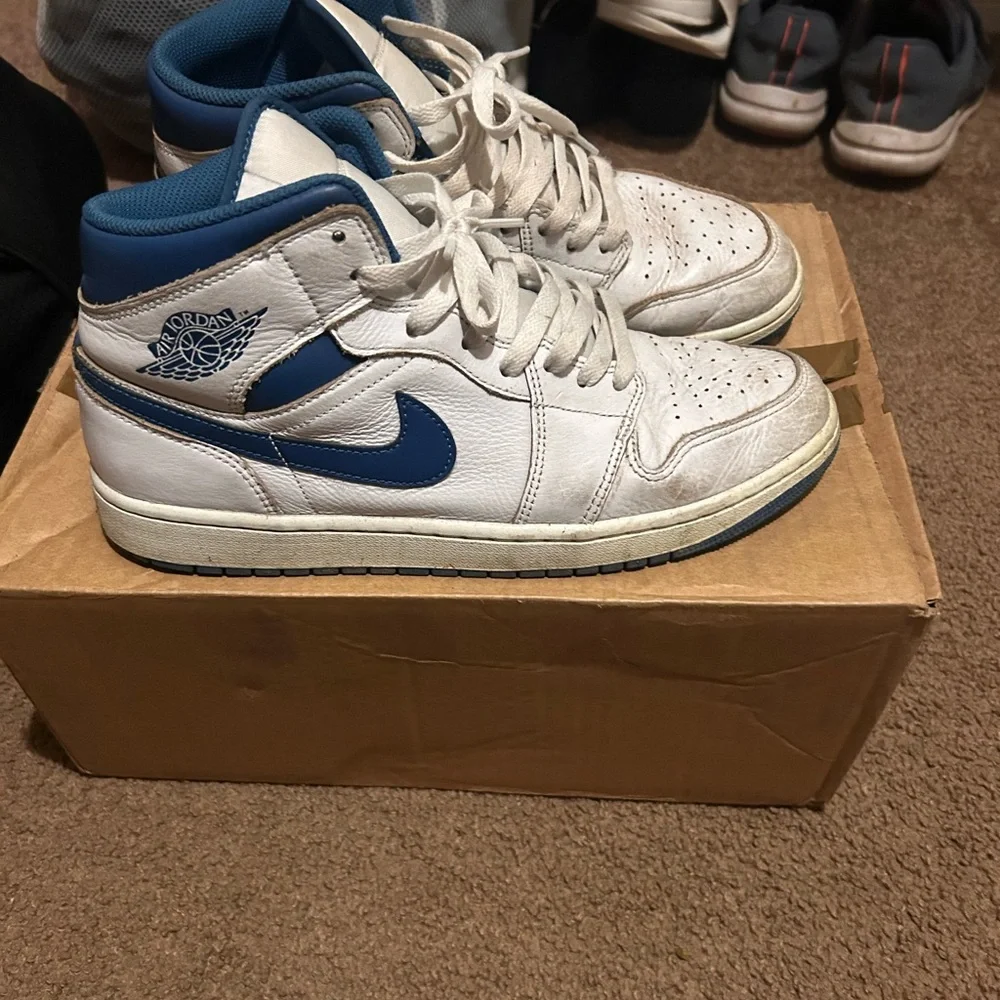 Stylish Jordan athletic shoes. White leather with blue accents. Iconic design for sports and casual wear. Needs TLC