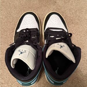 Jordan 1 in a deep teal, black, sail, & white colorway.