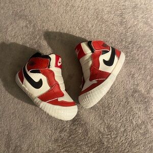 “Chicago” Jordan 1 size 2c euc soft bottom Vibrant red and white Nike sneakers for kids. Sleek design with iconic logo. Ideal for play and everyday wear.