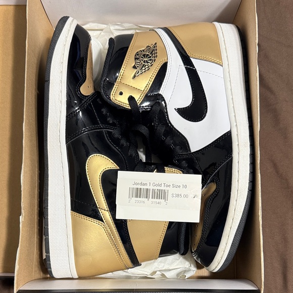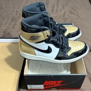 Elevate your look with these Jordan 1 sneakers. Bold black, white, and gold design. Iconic style and comfort.