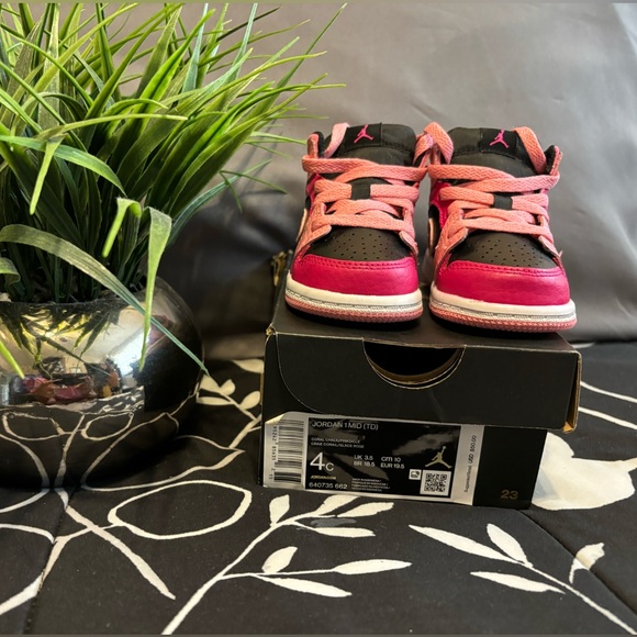 Jordan 1 Mid Coral/Chalk Pinksickle sneaker. Cute little sneaker for girls. I bought these for my granddaughter. Very well taken care of. I’ve wiped and cleaned them with antibacterial wipes. All items come from a smoke and pet free home.
